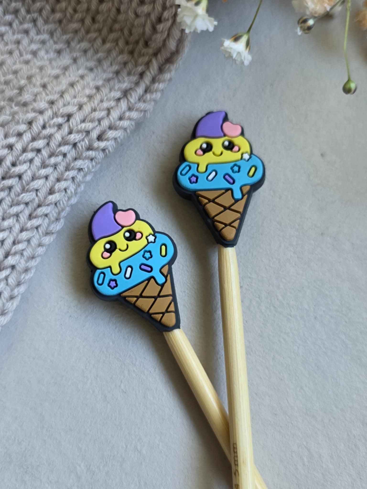 Brukes til å sette på pinnene når strikketøyet hviler, slik at maskene ikke faller av.