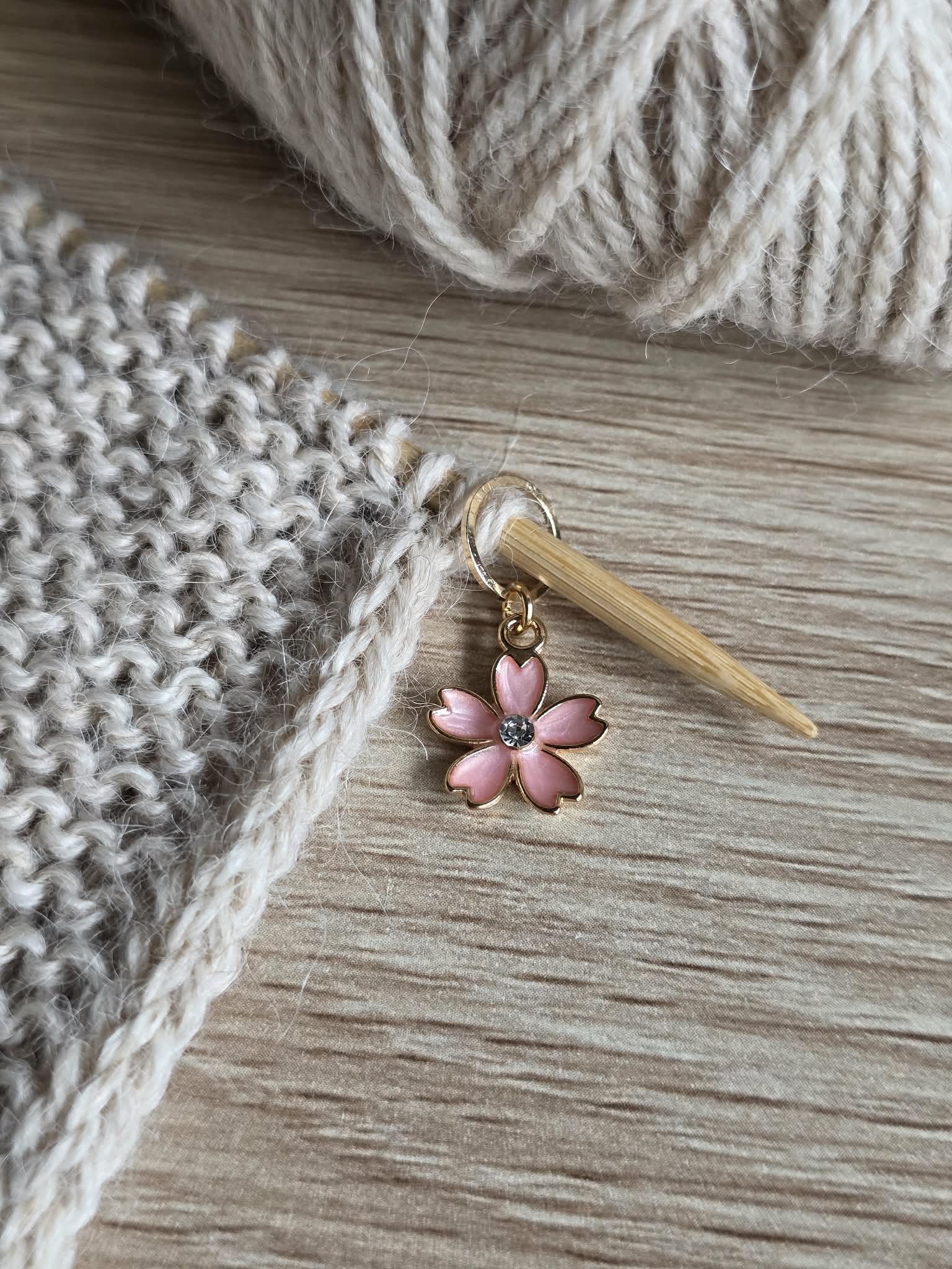 Liten rosa blomst med bling – små detaljer som gjør strikkingen ekstra koselig.