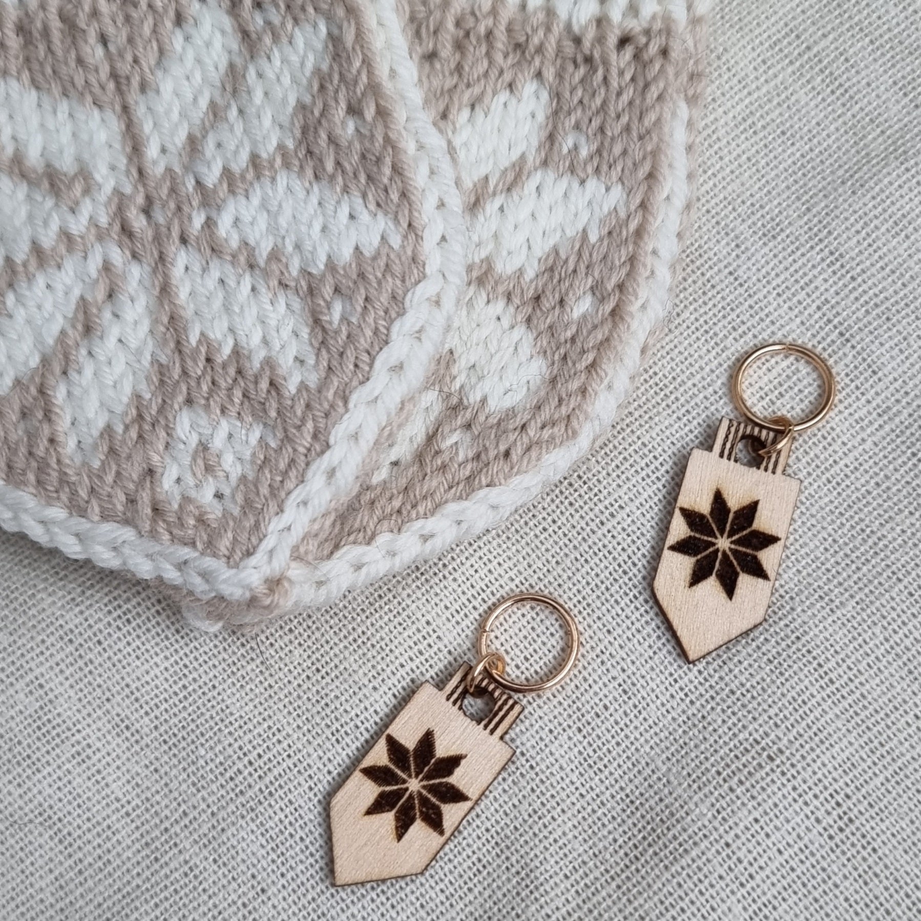 Votter med selbumønster. Små maskemarkører i tre med inngravert selbumønster.